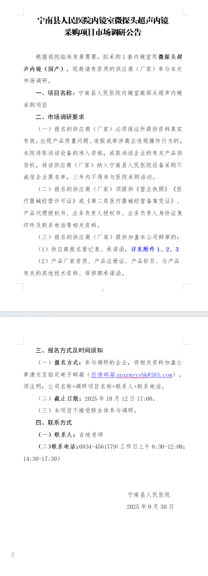 宁南县人民医院内镜室微探头超声内镜采购项目市场调研公告