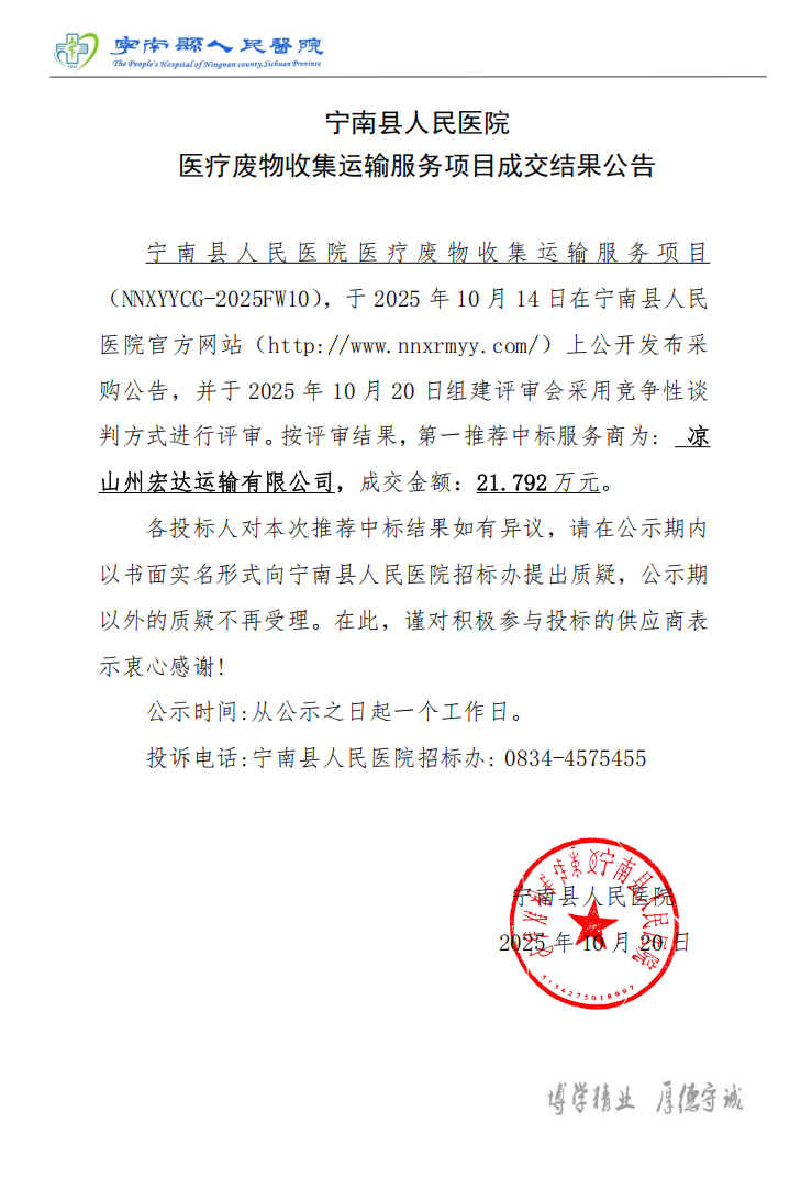 宁南县人民医院医疗废物收集运输服务项目成交结果公告
